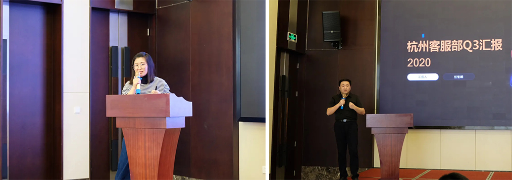 接下來,南京首屏副總經(jīng)理高娜、杭州客服部總監(jiān)任智鵬分別針對南京、杭州客服業(yè)務(wù)開展工作匯報(bào),深度剖析Q3工作成果、分析總結(jié)存在的問題和難點(diǎn),并對Q4的工作重心進(jìn)行詳細(xì)規(guī)劃。
